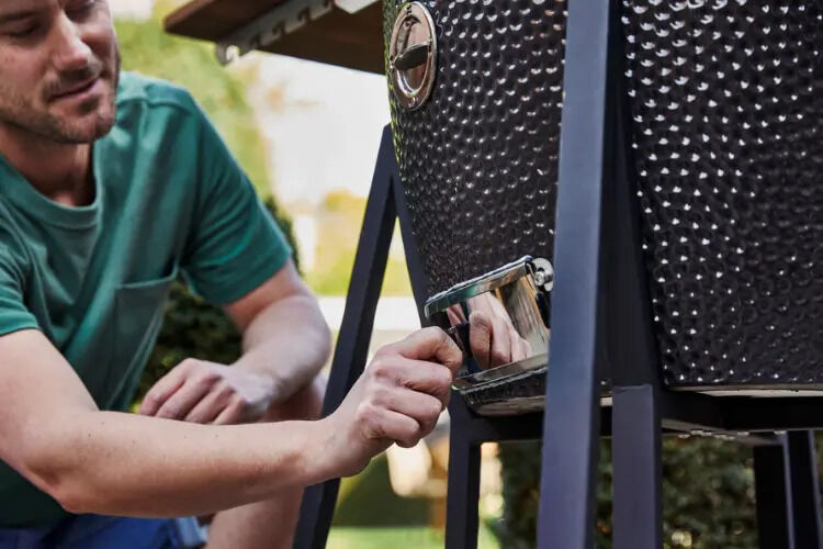 Om de temperatuur te verhogen, schuif je de luchtroosters een beetje verder open, zo kan er meer lucht – en dus zuurstof – in de kamado. Om de temperatuur te verlagen, doe je de luchtroosters iets meer dicht.