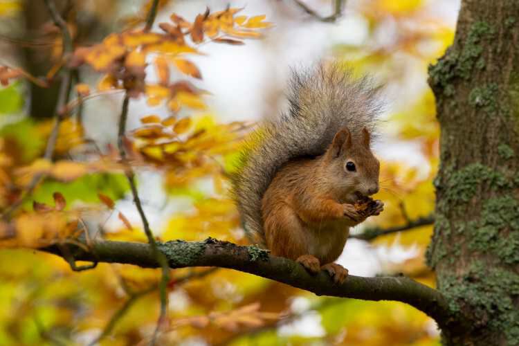 De herst is een drukke tijd voor eekhoorns. Ze slaan dan voedsel op voor de winter. Eekhoorns zijn dol op hazelnoten, beukennootjes en tamme kastanjes. Daarnaast verzamelen ze graag verschillende soorten paddenstoelen, zaden, bessen, eikels, dennenappels en zelfs stukjes boomschors.