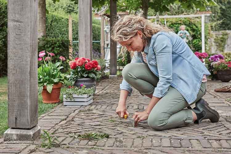 Je kunt de bestrating schoonmaken met een elektrische onkruidborstel of met een bestrijdingsmiddel tegen groene aanslag. Ga je met een concentraat en een drukspuit in de weer, doe dat dan op een windstille dag. Je kunt de bestrating ook schoonspuiten met een hogedrukreiniger. Wel gaat dat met wat meer geweld. Probeer daarom eerst een stukje uit, om te kijken of je terrastegels ertegen kunnen.