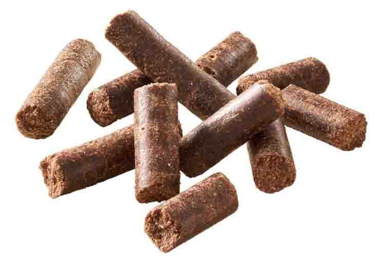 For pressed dog food, the ingredients are ground. The oils and fats are added immediately and the mixture is heated with steam to about 75 degrees Celsius. The mixture is pressed and the chunks are cut to size. The result is a compact chunk that feels smooth.