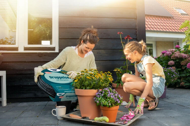 - Voor bloempotten is er een speciale druppelset. Deze werkt ook met een druppelslang, maar hier prik je de gaatjes zelf met de bijgeleverde gaatjesprikker – zo dicht mogelijk bij elke bloempot. Je hoeft dus niet je hele balkon of terras opnieuw in te richten. Nog een verschil in deze set van Summerrain is de druppelaar: bij elk gaatje hoort een druppelpin. Die loopt subtiel langs de bloempot omhoog, zodat het water van bovenaf in de pot sijpelt.
